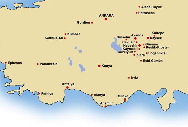 Heiliger Berg Erciyes Dagi, Firaktin hethitische Felsreliefs, Ivriz hethitische Felsreliefs, Fahrt zur Südküste, Strand bei Tasucu, Burg Anamur, Anamurium, Strand bei Alanya, Strand bei Antalya, Fethiye, Ephesos, Hierapolis, Pamukkale, Kaklik-Kalksinterhöhle, Köhnüs-Tal und phrygisches Felsheiligtum