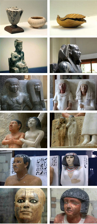 Die geheimnisumwitterte, faszinierende Hochkultur des antiken Ägyptens mit ihrer an Schönheit und Anmut nicht zu übertreffenden Hinterlassenschaft, spiegelt sich in einer einzigartigen Konzentration in der Schatzkammer Ägyptens, im Museum in Kairo. Kunstwerke und Monumente aus pharaonischer Zeit finden keine Entsprechung auf dieser Erde, außer in der Mythologie selbst, aus der sie entstammen. Was sich zwischen etwa 3500 vor unserer Zeitrechnung bis zur römischen Epoche in diesem schmalen, von Wüsten flankierten, fruchtbaren, oftmals nur wenige Kilometer breiten vom Wasser des Nils gespeisten Land entwickelte, gilt als Geburtstunde unserer Zivilisation. 30 Dynastien oder königliche Familien sind bekannt. Diese Dokumentation beginnt bei einigen der ältesten Fundstücken aus pharaonischer Zeit. Ich sehe elegante Kosmetikbehälter, die zart schillernde Lotosblüte aus der 1. Dynastie (etwa 2850 v. Chr.), die aufklappbare Goldmuschel aus der 3. Dynastie (etwa 2600 v. Chr.). Ich stehe vor den Bildnissen großer Herrscher des Pyramidenzeitalters, hochrangiger Hofangestellter, vor Paaren, Familien mit Kindern. Ich betrachte vornehme Damen in durchscheinenden Gewändern, Musikanten, Landarbeiter, Handwerker, Schreiber, Hausangestellte... Ich staune über die mir so vertrauten Dinge des täglichen Lebens, über Kleidung, Schminktechnik, Frisuren, Schmuck, Werkzeuge, Möbel... Ich sehe den Menschen dieser Zeit zu, wie sie Fische fangen, Brot backen, kochen, Bier brauen, Stoffe weben, Holz bearbeiten, Tiere zählen und Tiere schlachten, wie sie tanzen und musizieren. Ich sehe kampfbereite Soldaten im Gleichschritt marschierend. Ich staune über die Kleidung schöner Damen, über ihre Schminktechnik, über ihre kunstvollen Perücken, über das, was das Leben im alten Ägypten lebenswert machte. Jede auch noch so kleine Skulptur, jedes Relief, jedes Gemälde, jeder Gebrauchs- und Kunstgegenstand wirkt wie ein Fotodokoment dieser im Wüstensand versunkenen Hochkultur am Nil. Alle geheimnisvollen Bilder, Statuen und Bauwerke aus pharaonischer Zeit entstammen der Ungewissheit über den Verlauf der Reise zwischen der irdischen Existenz und der Unterwelt. Lebende mussten Opfergaben bereitstellen und Grabdienste leisten, damit tote Verwandte ihren Einfluss beim Himmelsgott Re geltend machten. Es war das Urprinzip der Verschmelzung zwischen dem Jetzt und dem Morgen, von dem die Pyramidentexte mit ihren dramatischen Inhalten, Hymnen, Litaneien und Zaubersprüchen Zeugnis ablegen. Architektur aus Menschenhand und Kosmos sollten eins werden, sollten auf magische Weise die dunkle dichte Urerde mit den Strahlen des Himmelslichtes vereinen.