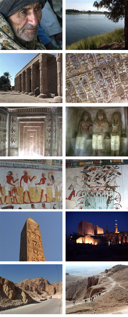Dörfer am Nil in Theben-West. Der Tempel von Sethos I. Gräber der Noblen in Theben-West. Das Grab des Benia, 18. Dynastie. Das Grab des Menna, 18. Dynastie. Der Luxor-Tempel am Abend. Vom Tal der Königinnen zum Tal der Könige. Achet-Aton, das Grab des Echnaton, Nordgräber und Nordpalast in el Amarna.
