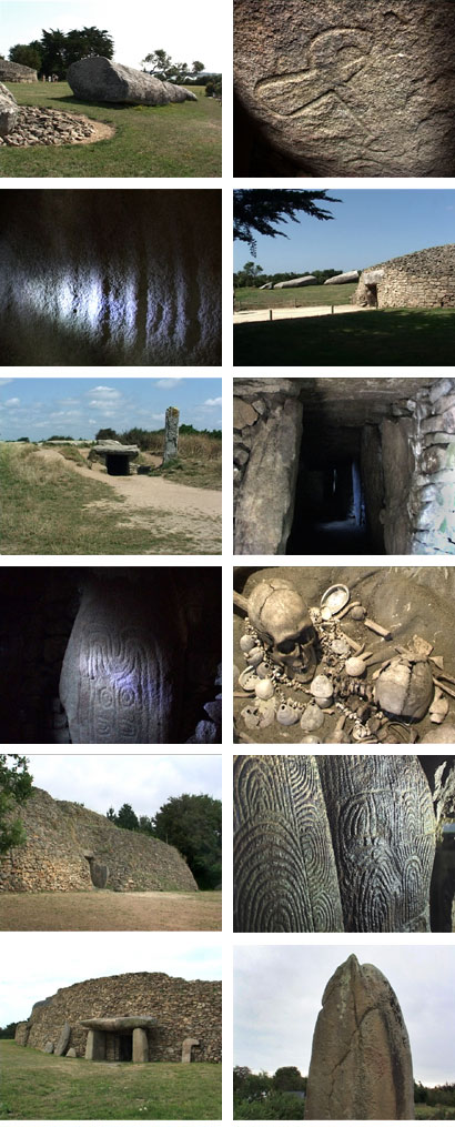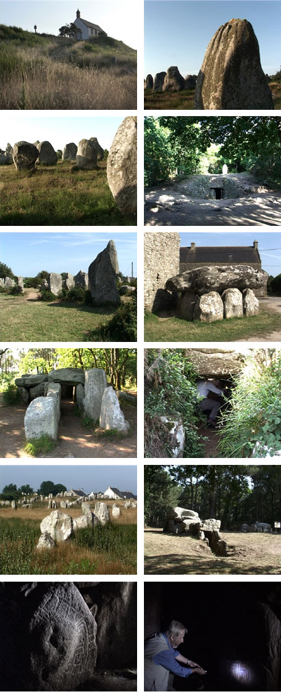 Der Tumulus Saint-Michel in Carnac ist das imposanteste Hügelgrab der Gegend. Das Christentum hat den für die Menschen der Vorzeit heiligen Ort vereinnahmt. Im 17. Jahrhundert wurde auf dem Monument eine Kirche errichtet... Die Steinalleen von Kermario erstrecken sich mit 1029 in zehn Reihen angeordneten Menhiren über 1120 Meter... Der Tumulus von Manio ist das älteste Monument im Raum Carnac. An der Basis eines drei Meter hohen Tragsteines entdeckten Archäologen fünf Schlangensymbole. Ausgrabungen am Fuß des Menhirs förderten fünf polierte Steinbeile zutage, die mit der Schneide nach oben zu den Schlangen deuteten... Der Riese von Manio beeindruckt durch seine menschenähnliche Gestalt... Bei Kerzerho folgen die Steinalleen in zehn Reihen der naturbelassenen Landschaft. Ehemals waren es mehrere tausend... Die Deckplatte des Dolmens von Crucuno wiegt über 40 Tonnen... Der Dolmen von Mané-Croh besitzt je zwei symetrisch vom Gang angeordnete Kammern... Der Tumulus von Rondossec umfasst drei Ganggräber. In einem wurden Ketten aus Gold gefunden... In den Steinalleen von Ménec bei Carnac befinden sich auf einer Strecke von 950 Meter 1169 Menhire in elf Reihen... Der Tumulus von Mane-Kerioned gehört zu den kulturhistorisch bedeutendsten der Bretagne. Rätselhafte und mystisch anmutende Gravuren wirken wie eine geheime Botschaft aus einer fernen Zeit... Der Grand Menhir Brisé, der größte Menhir des Neolithikums, liegt viergeteilt mit 20 Meter Länge und 350 Tonnen Gewicht am Boden... Im Dolmen Table des Marchand wurde das Bruchstück eines Riesenmenhirs mit der Gravur einer Steinaxt als Deckplatte verarbeitet. Ein als Rückwand verwendetes Menhirbruchstück ist mit 54 Krummstäben ausgestattet, Ackerbaugeräte... Im Tumulus von Pierres-Plates erschrecke ich im Licht meiner Taschenlampe über ein Fabelwesen, symetrisch und wulstig wie der Kopf eines Ungeheuers, halb Tier, halb Mensch... Das Prähistorische Museum in Carnac beherbergt die reichhaltigste Sammlung an megalithischen Funden der Welt... Auf der kleinen Insel Gavrinis, im Golf von Morbihan, befindet sich das schönste, aufwändig mit rätselhaften Gravuren ausgestattete Langgrab der Megalithkultur... Die Ile aux Moines bietet zahlreiche Wanderwege in mediteran anmutender Landschaft... Der Cairn le petit Mont besitzt eine wechselhafte Vergangenheit. 1943 wurde er zu einem Teil als Bunker umfunktioniert... Auf dem Tumulus von Tumiac soll Cäsar gestanden haben um die Seeschlacht seiner Truppen gegen die Veneter zu verfolgen... Das Archäologische Museum in Vannes beherbergt vornehmlich Funde von Ausgrabungen der Umgebung.