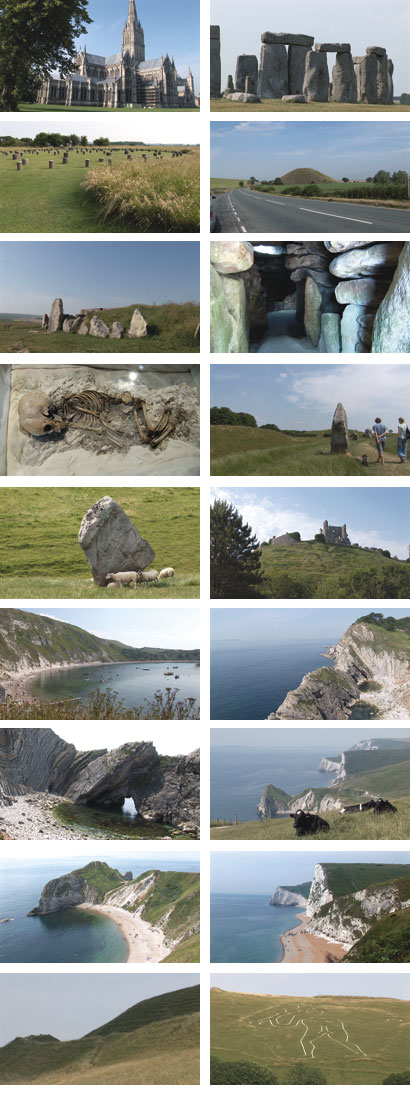 Salisbury, Old Sarum, Stonehenge, Woodhenge, Silbury Hill, Westkennet Longbarrow, Avebury, White Horse Uffington, Pool Hafen, Corfe Castle, Jurassic Coast, Lulworth Cove, Maiden Castle, Giant Cerne Abbas, Lyme Regis, Blackbury Camp, Ottery St. Mary, Exeter Kathedrale, Teignmouth, Dartmouth, Totnes Castle, Dartmoor, Lydford, Grimspound, Postbridges.