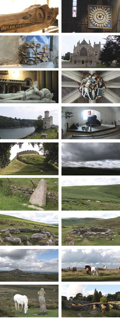 Im Jahre 1220 geschah etwas in der Geschichte Einzigartiges. Eine ganze Stadt zog um, weil der Bischof es so wollte. Daraus entstand Salisbury, die Kleinstadt mit der stilistisch reinsten aller englischen Kathedralen... Stonehenge, das bekannteste Monument der Megalithkultur, ist die Krönung der Landschaft in der Ebene von Salisbury. Ein religiöses Zentrum, ein Observatorium, in jedem Falle ein Prestigebau, Symbol der Ewigkeit ohne Anfang und ohne Ende. Ein Kraftzentrum, noch immer angereichert mit kosmischem Lebensgefühl... Woodhenge, nur drei km entfernt, ist ein Heiligtum vergleichbaren Alters, vergleichbarer Größe, gebaut aus vergänglichem Material, aus Holz... Bei dem kleinen Ort Avebury befinden sich wahre Superlativen des frühen Menschseins. Silbury Hill, der größte vorgeschichtliche Tumulus Europas ist nur gering erforscht. Der Legende nach soll dort ein König bestattet sein, sitzend auf einem Pferd aus reinem Gold... Nur wenige hundert Meter entfernt erkunde ich sehr ausführlich das Hügelgrab Westkennet Longbarrow, das längste Megalithmonument Europas... Der kleine Ort Avebury hat sich hineingefressen in einen der größten Steinkreise Europas. 700 roh behauene Riesensteine, bis zu 5,5 Meter hoch und 40 Tonnen schwer, bildeten den äußeren Ring... Corfe Castle ist ein geschichtsträchtiger Ort mit einer angelsächsischen Burg, die unter den Normannen zu einer imposanten Festung ausgebaut wurde... Lulworth Cove, an der berühmten Jurassic Coast, ist ein kreisrunder Naturhafen, eingebettet in eine traumhaft wilde Küstenszenerie. Saurierland, so kann man diesen Küstenabschnitt kurz umschreiben. Zahlreiche Fußabdrücke und Skelettfragmente der Riesenechsen wurden hier gefunden. Bei der Klippenwanderung zum Durdle Door erschließt sich die ganze Schönheit dieser Landschaft mit den paradiesartigen Stränden... Maiden Castle ist die größte eisenzeitliche Hügelfestung Europas. Gallier, Siedler aus der Bretagne, wahrscheinlich auf der Flucht vor den Römern, haben das noch immer beeindruckende Bauwerk geschaffen... Im kleinen Fossilienmuseum von Lyme Regis wird die von Riesenechsen geprägte Urzeit anhand von Originalen und Nachbildungen anschaulich dokumentiert... Die Dorfkathedrale in Ottery St. Mary hütet einen Juwel der Zeitmessung, eine astronomische Uhr, gestaltet im ptolemäischen Weltbild. Im Zentrum steht die Erde, um die sich Sonne, Mond und Sterne drehen. Die Uhr arbeitet seit mehr als 650 Jahren mit dem Original-Uhrwerk, präzise, wie keine andere ihrer Art... Die Kathedrale von Exeter gilt als Glanzlicht hochgotischer Architektur. Die Westfassade gleicht einem Geschichtsbuch. Große Herrscher und Eroberer sind hier verewigt... Das Dartmouth Castle, im 15. Jh. als eine von 4 Geschützstellungen im Mündungsbereich des Rivers Dart errichtet, erfüllte bis in den 2. Weltkrieg hinein eine militärische Funktion. Totnes, eine lebendige Hafenstadt, birgt eines der beeindruckendsten Castles der normannischen Epoche... Das Landschaftsschutzgebiet Dartmoor wirkt auf mich wie eine Insel auf der Insel, magisch anziehend, mystisch und abweisend zugleich. Natur pur soweit das Auge reicht. Die Asphaltstraße wird von den frei lebenden Ponys kaum wahrgenommen. Ihr Lebensraum ist zaun- und heckenlos, besitzt keine Grenzen... Lydford Castle war das erste Gefängnis im Dartmoor... In der Bronzezeit-Siedlung Grimspound bin ich allein mit der Mystik des Lebensraums urzeitlicher Siedler. Ich kann hineinschauen in ihre kreisrunden Häuser, ausgestattet mit steinernen Sitzmöbeln und Herdstellen... Die Klapperbridge bei Postbridges aus dem 13. Jh. wirkt im tiefen Abendlicht wie ein Teil der Landschaft, gewachsen in ihrem Schatten...