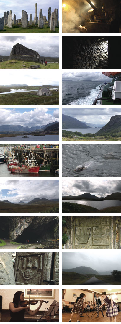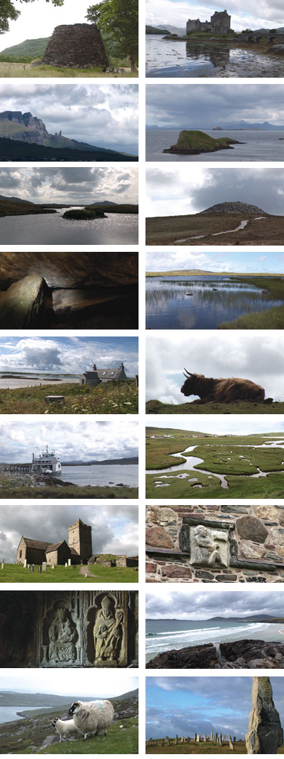 Herausragende Landschaften und Kulturstätten auf den Hebriden und im Nord-Westen Schottlands: Dun Telve, Dun Troddam, Eilean Donan Castle, Insel Skye, Kilvaxter Erdhaus, Insel North Juist, Barpa Langass Cairn, Insel Harris, Rodel Church, Insel Lewis, Callanish Standing Stones, Arnol Black House Museum, Dun Carloway, Highlands Westküste, Gairloch Museum, Loch Maree, Ullapool, Loch Assynt, Durness Smoo Cave, Bettyhill Museum, Folklore in Thurso