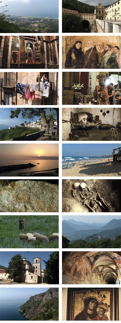 San Francesco di Páola ist der Schutzheilige Kalabriens. Während des Patronatsfestes gedenken die frommen Kalabresen am Ort seines Wirkens der vielen Wunder, die diesem Gottesmann zugeschrieben werden. Im Jahr 1464 soll es ihm gelungen sein, auf seinem Mantel stehend die wegen ihrer Strudel gefürchtete Meerenge zwischen Kalabrien und Sizilien zu überqueren. Ein Teil des Mantels und viele die Wunder dokumentierende Fresken haben die Zeit überdauert... Cosenza wurde im Jahr 410 von Westgoten erobert, nachdem sie zuvor Rom geplündert hatten. Ihr Anführer König Alarich soll am Fuß des Stadtfelsens im Flussbett des Busento, hoch zu Ross mit unermesslichen Schätzen beigesetzt worden sein... Festungsgleich, 515 Meter über der Küste des Tyrrhenischen Meeres, schwebt Guardia Piemontese. Vor der Inquisition geflohene Waldenser aus dem norditalienischen Piemont haben die Stadt im 13. Jh. gegründet. Am Abend des 3. Juni 1561 wurde der Ort durch eine List erobert. 2000 Waldenser wurden abgeschlachtet... Scalea gehört zu den ältesten Städten Kalabriens. Der Ort geht auf eine griechische Kolonie des 6. vorchr. Jh. zurück... Papasídero ist byzantinischen Ursprungs. Im Ortsnamen lebt die Erinnerung an einen griechischen Abt, der sich hier mit seiner Mönchsgemeinde niederließ... Die Grotta del Romito am Abhang des Lao-Flusses ist ein schon vor 20.000 Jahren genutzter Schutzraum und Kultort. Ihre Entdeckung 1961 war eine Sensation. Auf einem zwei Meter breiten Felsblock befinden sich 15.000 Jahre alte Ritzzeichnungen zweier Auerochsen... Das ehemalige Convento San Antonio di Padova am Fuß des Altstadthügels von Rivello entstammt dem frühen 16. Jh.. Schon die Ausgestaltung der zweibogigen Renaissance-Vorhalle erfüllt mich mit großem Respekt. Auch die unteren Wandelhallen des zweigeschossigen Kreuzganges sind großflächig mit Fresken geschmückt... Melfi war in hellenistischer Zeit im Völkergemisch der frühen Kolonisten Knotenpunkt der Kulturen... Der Kratersee Lago Piccolo ist einer von zweien, die sich in der lukanischen Abgeschiedenheit ihre paradiesische Schlichtheit erhalten konnten... Ripacandida ist ein kleines Dorf mit einer einzigartigen Attraktion. Besiedelt schon im 7. vorchr. Jh., befestigt durch die Langobarden, zieht die im 11. Jh. gegründete Kirche San Donato Touristen aus aller Welt an. In einem nur annähernd vergleichbar ausgeschmückten Raum habe ich noch nicht gestanden. Wohin ich auch schaue, Bilder, Bilder, Bilder. Es handelt sich um eine illustrierte Bibel für Menschen, die nicht lesen können. Die Fresken des Alten Testaments entstanden wahrscheinlich schon im Jahr 1506... Die sehr alte Stadt Venosa gehörte zum Siedlungsgebiet der Samniten. Den Römern gelang die Eroberung im Jahr 291 v. Chr. Sie nannten ihre erste Kolonie im Süden Italiens Venusia, nach der Göttin Venus... Der Dom von Acerenza gilt als eine der bedeutendsten Sehenswürdigkeiten der Basilikata. Am Skulpturenreigen, der das Hauptportal schmückt, haben namhafte Steinmetze ihrer Zeit gearbeitet. Dämonen, Fabelwesen, Tiere, Musikanten, nackte Gestalten, tanzende Paare, Engel, Nymphen und undefinierbare Wesen sind wie eine Kette vergnüglicher und erschreckender Ereignisse miteinander verwoben... Matera, seit der Steinzeit bewohnt, gilt als eine der ältesten Städte der Welt. Wie eine Fatamorgana erlebe ich die von der UNESCO im Jahr 1993 als Weltkulturerbe klassifizierte Höhlensiedlung am Steilufer der Gravina-Schlucht. Seit dem 8. Jahrtausend vor der Zeitrechnung suchten Menschen Schutz in den von ihnen in den weichen Tuff gegrabenen Höhlen. Basilianer- und Benediktinermönche ließen sich hier nieder. Ihnen folgten die Bauern der Gegend. Viele Grottenkirchen entstanden. Erhaltene Fresken zeugen eindrucksvoll vom Erwachen des Christentums im Süden Italiens ...