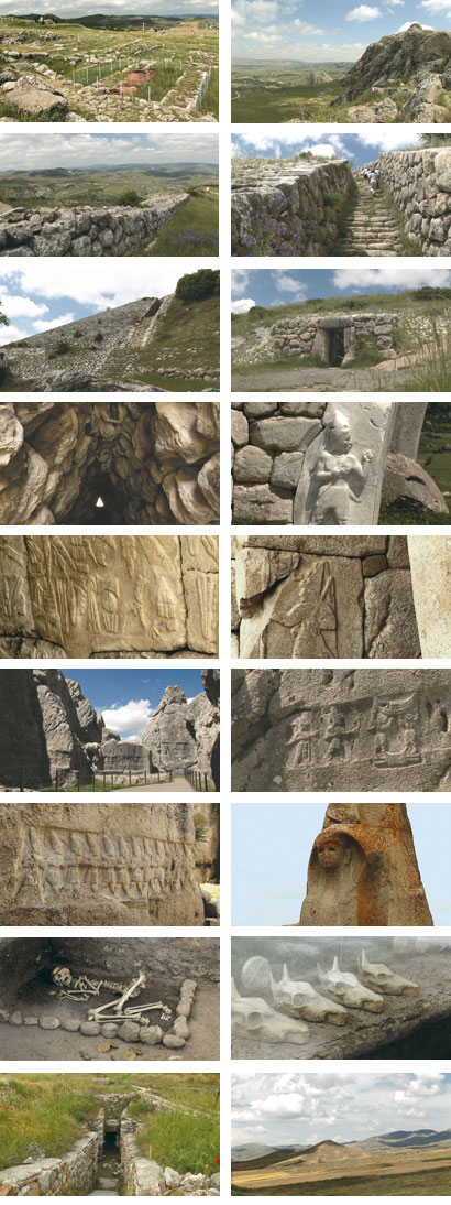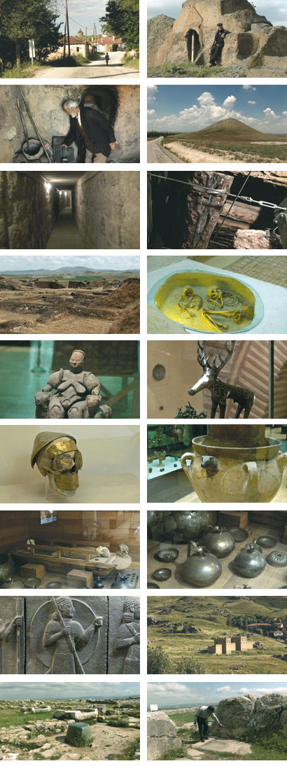 Ich befinde mich im Kernland des zum Beginn des ersten vorchristlichen Jahrtausends erblühten Großreichs der Phryger. Auf dem Felssporn, beim heutigen Dorf Kümbet, befand sich eine der vielen, die Ansiedlungen im Tal schützenden Bergfestungen... Vom machtpolitischen Höhepunkt der phrygischen Epoche zeugen etwa 80 große Grabhügel im Umfeld von Gordion, der Hauptstadt des Phrygerreichs. Im größten Tumulus wurde eine unversehrte, reich ausgestattete, wahrscheinlich für einen König errichtete Grabkammer freigelegt... Das kleine Museum beherbergt Fundstücke der bis heute durchgeführten Grabungen... Mächtige Mauern und Tore, die im 7. Jh. als uneinnehmbar galten, umringen das älteste, schon von den Hethitern genutzte Siedlungsgebiet, auf dem120 Meter hohen Felskegel im Herzen der Metropole Ankara. Hier befindet sich das Museum für Anatolische Zivilisation. Ursprünglich als Hethiter-Museum geplant, beherbergt das Gebäude heute Fundstücke aus allen anatolischen Siedlungsepochen, begonnen bei der Steinzeit... Etwa 150 Kilometer östlich von Ankara erkunde ich, in Begleitung eines ortskundigen Führers, Hattuscha, die Hauptstadt des einst bedeutenden Hethiterreichs. Sie ist riesig. Die Tatsache, dass außer den massiven Steinelementen und Sockelmauern so gut wie nichts von der alten Bedeutung und Größe der Bauwerke zeugt liegt darin begründet, dass Hattuscha wahrscheinlich schon vor der endgültigen Zerstörung und Brandlegung von den Bewohnern verlassen wurde... Im 14. Jh. vor der Zeitrechnung, auf dem Höhepunkt des hethitischen Reichs, entstanden zahlreiche Großbauten und viele Tempel. Doch schon 100 Jahre darauf mussten die Befestigungsanlagen wesentlich verstärkt und Kultstätten in der Oberstadt aufgegeben werden, damit mehr Menschen innerhalb der Stadtmauern Schutz fanden... Das Löwentor hat beim Großbrand viel von seiner einstigen Gestalt eingebüßt. Wie alle Stadttore Hattuschas wurde es von zwei mächtigen Türmen flankiert... Die rechte Löwen-Skulptur ist noch vollständig erhalten... Hattuscha war nicht nur die politische Metropole des Hethiterreichs sondern auch das religiöse Zentrum, somit Residenz der „tausend Götter des Hatti-Landes“. Bisher wurden die Sockelmauern von 24 großen Tempelanlagen ausgegraben... Der höchste und zugleich südlichste Punkt von Hattuscha wurde durch einen künstlich aufgeschichteten Wall auf einer Gesamtlänge von 280 Meter um 15 Meter erhöht. Der aufgeschüttete Wall ist an der Basis 80 Meter dick. Er wurde über einem im Gefälle nach außen führenden gemauerten Gang errichtet. Darüber verläuft die Stadtmauer mit dem Sphinxtor. Die auf dem Kamm der Aufschüttung entlang führende Stadtmauer war in diesem Bereich zusätzlich mit einer Vormauer und sechs Türmen gesichert. Das alles macht nachdenklich. Es gibt keine Parallele für ein vergleichbares Bauwerk... In den mit eindrucksvollen Reliefs reich verzierten Kulträumen von Yazilikaya, im Haus des Wettergottes, feierten die Bewohner von Hatuscha mit dem Königshaus und allen Göttern das Frühlingsfest... Alaca Höyük ist die Hauptstadt eines der vielen, die Kulturgeschichte Anatoliens prägenden hattischen Fürstentümer der frühen Bronzezeit... In Alaca Höyük wurden Priesterfürsten bestattet, umgeben von kostbaren Grabbeigaben und Köpfen der für das Totenmal geschlachteten Opfertiere...