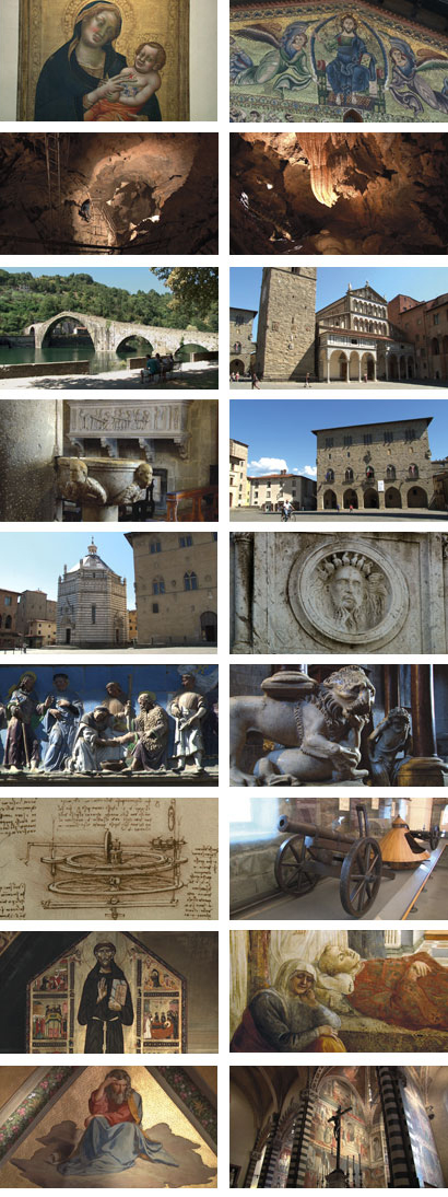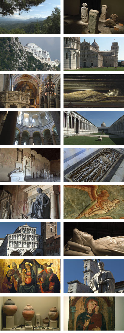 Museo delle Statue-Stele in Pontremoli; Ponzanello, Borgo 12. Jh.; Marmorbrüche bei Carrara; Pisa: Dom Santa Maria Assunta, Baptisterium, Camposanto, Museo delle Sinopie; Lucca: Dom San Martino, Nationalmuseum, San Frediano; Ponte del Diavolo; Grotta del Vento; Pistoia: Dom San Zeno, Baptisterium, Palazzi, Ospedale del Ceppo, Sant’ Andrea; Museo Leonardiano in Vinci; Prato: Dom Santo Stefano