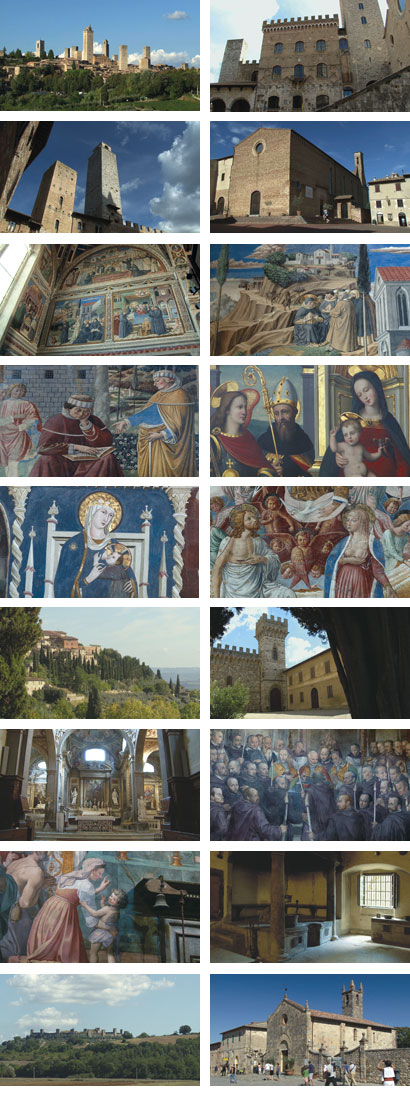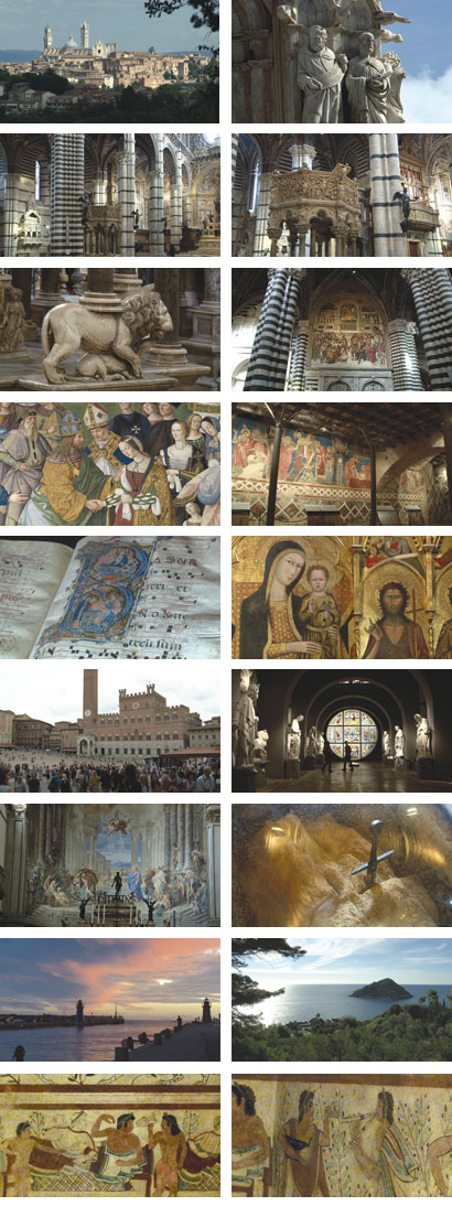 San Gimignano: Arco dei Becci, Piazza della Cisterna, Piazza del Duomo, Sant’ Agostino; Abtei Badia a Passignano; Volpaia, Borgo 12. Jh.; Siena: Dom Santa Maria, Baptisterium, Krypta, Piazza del Campo, Ospedale di Santa Maria della Scala, Museo dell’ Opera Metropolitana; Capella di Monte Siepi; Castiglione della Pescaia; Populonia am Golf von Baratti; Porto Ercole; Tarquinia; Saturnia