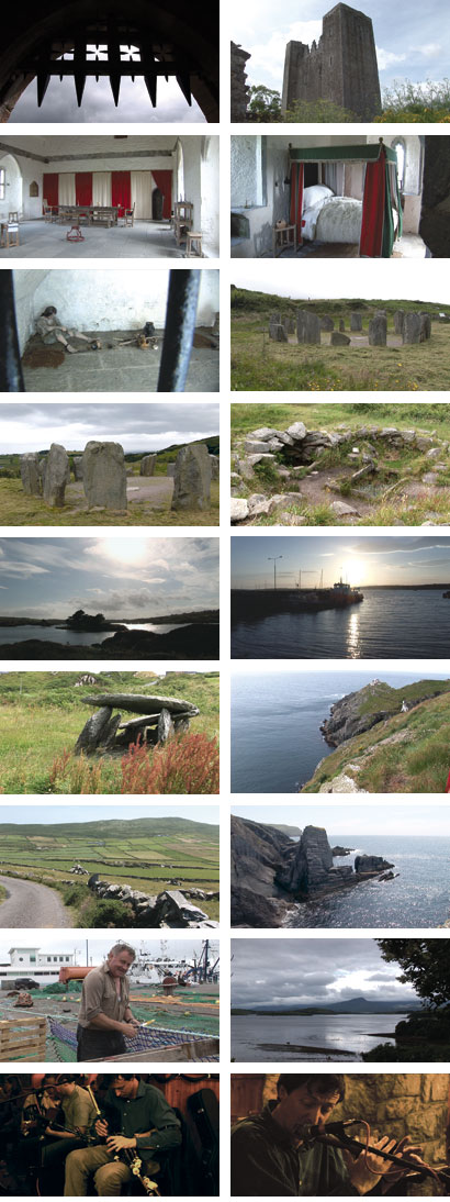 Im Irish National Heritage Park bei Wexford ist die Besiedelung der Insel, von der Steinzeit, etwa 7000 vor unserer Zeitrechnung ausgehend, bis zur Eroberung durch die Anglo-Normannen aus England im 12. Jh. in der Rekonstruktion von Behausungen, Gräbern, befestigten Wohn- und Wehranlagen, Kirchen, Köstern und Werkstätten sehr anschaulich dargestellt... Der Hook Leuchtturm ist einer der ältesten, noch aktiven der Welt. Er wird auf das frühe 12. Jh. datiert... Die Küste zwischen Waterford und Ardmore ist atemberaubend schön. Hier muss man sich viel Zeit lassen... Die Klosterruine bei Ardmore ist zu jeder Tageszeit ein spiritueller Ort ersten Ranges. Der Boden ist getränkt mit dem Blut der Mönche während der Epoche nicht enden wollender Raubzüge der Wikinger... Der Rock of Cashel trägt die größte und eindrucksvollste Klosterruine Irlands. Natur, Geschichte und Architektur verschmelzen zu einem Ensemble ohne Gleichen. Der Rock of Cashel gilt zu Recht als Wunderwerk frühchristlicher Baukunst... In Cahir, etwa 20 km südlich von Cashel befindet sich auf einer Felsinsel im Fluss Sur die in der Zeit ihrer Nutzung mächtigste Burganlage Irlands. Die Festungsanlage besitzt einen für irische Verhältnisse ungewöhnlich wehrhaften Grundriss... Barryscourt Castle ist ein vollständig erhaltenes, wieder eingerichtetes Towerhaus im anglo-normannischen Stil. Die dicken Mauern und die Wehrhaftigkeit der Gesamtanlage bezeugen, dass die Begüterten Eroberer aus England immer mit dem Widerstand der Urbevölkerung rechnen mussten... Der Drombeg Stone Circle an der Südküste ist ein für die irische Geschichte bedeutender Ort. 17 aufrecht stehende Steine begrenzen einen für die Erbauer heiligen Bereich. Steinkreise sind die ersten Kathedralen der Menschheitsgeschichte, die ersten religiösen Gemeinschaftsbauten im europäischen Raum... Nur etwa 40 Meter von der eindrucksvollen Kultstätte entfernt zeugen die Reste zweier Hütten und einer Kochstelle von den Lebensbedingungen im 3. Jahrtausend vor unserer Zeitrechnung... Paradiesartig empfinde ich die Landschaft auf dem Weg nach Baltimore, einem der südlichsten Orte Irlands. Es fällt schwer, die räumliche Orientierung zu wahren, in der dichten Folge kleiner Buchten und Landzungen der Mizen-Halbinsel.. Auf einer vorgelagerten Insel wurde 1909, nach einer Folge schwerer Schiffsunglücke, ein Lighthouse mit Radiostation errichtet. Der Weg dorthin, über eine bei jedem Schritt vibrierende Brücke, ist ein kleines Abenteuer... Die Mizen-Halbinsel ist mein Tipp für Wandern und Radfahren in Irland. Sie bietet eine Fülle rasch wechselnder immer beeindruckender Landschaften... Ich lasse mich treiben, so dicht wie möglich an der schroffen Küste entlang, genieße mit den Augen und mit den Sinnen die Farben und markanten Formen der unzähligen, kleine Parzellen begrenzenden Steinmauern, weit weit weg von jeder menschlichen Ansiedlung... In Kenmare findet ein Musikfest statt... Den Ausklang dieses Films bilden Ausschnitte einer Irisch Music Session hoher Qualität. Wer das Glück hat, ein solches Pubgeschehen zu erleben, ist diesen Klängen verfallen, gleich ob es sich um getragene von traurigen Zeiten handelnde Songs oder um von Lebensfreude sprühende schnelle Tänze handelt. Die Klänge werden zum Rauschmittel, dem man sich nicht entziehen kann...