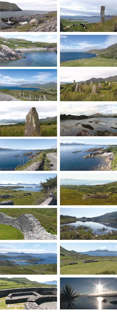 Die Beara-Halbinsel an der Südküste ist reich an Naturschönheit und historisch bedeutenden Bauwerken... Das Teernahillane Ringfort ist eine ungewöhnliche jungsteinzeitliche Befestigungsanlage. Sie ragt etwa drei Meter in die Höhe und besitzt keinen Steinwall... Auf Dursey Island leben heute nur noch zwei Familien vom Fischfang und von der Viehzucht, wie ihre Vorfahren... Der Ring of Beara wird touristisch wenig beworben. Die schmalen, oft einspurigen Küstenstraßen sind für Busse nicht befahrbar. Die Fahrt entlang der Nordküste, in Richtung Kenmare, kommt mir vor, wie eine Reise zum Ende der Welt... Der Ardgroom Steinkreis besitzt eine besondere Verbindung zu einem Cairn, einem mit Erde abgedeckten Grabhügel, kreisrund mit Steinen verziert. Das tiefe Licht des Tages modelliert die Kultstätte sehr markant. Wie Theaterscheinwerfer beleben die Sonnenstrahlen diese, mit großem Aufwand errichtete, von göttlichen Kräften durchwobene Ewigkeitsresidenz für die Ahnen... Der Ring of Kerry ist die bekannteste irische Touristenstraße, eine 176 km lange zweispurig ausgebaute Küstenroute. Das milde Klima hat eine Reihe bunt herausgeputzter Badeorte entstehen lassen... Das Staigue Stone Fort, ein Bauwerk der Eisenzeit, ist eines der besterhaltenen seiner Art in Europa. Ein Bollwerk gewaltiger Ausmaße mit bis zu sechs Meter hohen und vier Meter dicken Wänden, auf einem von Menschenhand geschaffenen Hügel, zwischen zwei Bachläufen, im oberen Bereich eines Talkessels, dreiseitig von Bergen geschützt. Über den Sinn und Zweck dieser mit geschwungener Mauer-krone ausgestatteten kreisförmigen Anlage wird viel spekuliert... Das Loher Stone Fort an der Südwestküste von Kerry wurde im 9. Jh zur Zeit der Wikingerüberfälle errichtet. Im Inneren sind die Wände von zwei Farmhäusern mit unterirdischen Fluchttunneln erhalten geblieben. Das perfekt geschichtete Trockenmauerwerk hat die Zeit unbeschadet überstanden... In Portmagee habe ich mich für einen Bootstripp zur Skellig Michael angemeldet. Die Abendstimmung im kleinen Hafen ist traumhaft. Die Fahrt zur 13 km südwestlich der Kerry-Halbinsel 218 Meter aus dem Atlantik ragenden kleinen Felsinsel dauert heute nur noch eine Stunde. Keltische Druiden und Mönche des frühen Christentums glaubten an diesem lebensfeindlichen Ort die Naturkräfte und den Kosmos besser studieren zu können. 670 vor mehr als 1.500 Jahren aus dem Felsgestein geschlagene Stufen müssen erklommen werden. Ein kleines Abenteuer, vielleicht eines der letzten dieser Art in Europa. Von den frommen Gottesmännern, die hier zwischen dem 6. und 12 Jh meditierten, zeugen nur noch etwa 20 Grabsteine und roh behauene verwitterte Steinkreuze. Ihre Hütten jedoch, aus lose Steinen kunstvoll aufgeschichtet, mit sich zum Dachbereich homogen und kuppelförmig verjüngenden Wänden, haben die Zeit überdauert. Eine mystische Stätte, einzigartig auf dieser Erde... In Killarney erlebe ich den letzten Abend eines großen Misikfestes und in Dingle eine Irish Music Session vom Feinsten... Die wenigen Kilometer über die Highlands von Kerry hinunter zur Dingle-Halbinsel haben es in sich. Immer wieder halte ich an und genieße Natur pur im wahrsten Sinne des Wortes...